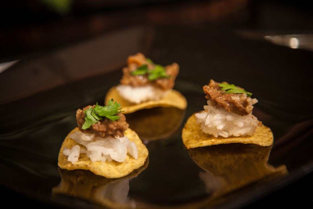 Bite-sized pieces of slow cooked beef curry served on sticky white rice.